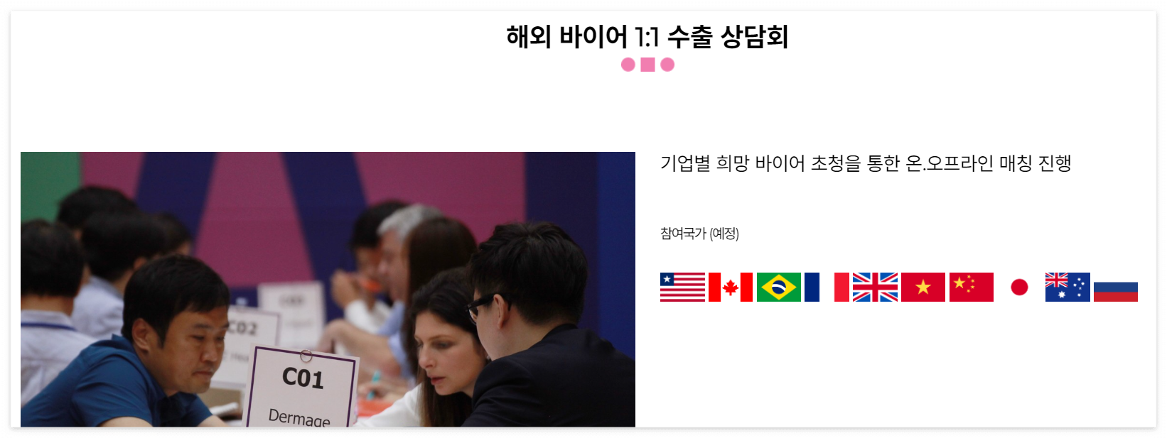 - 해외 바이어 상담회: 국내외 기업 간 비즈니스 매칭을 지원