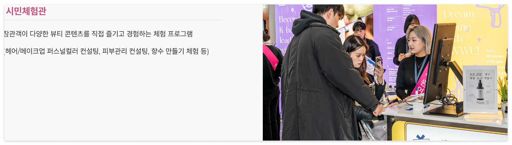 - 시민체험관: 참관객이 다양한 뷰티 콘텐츠를 직접 즐기고 경험하는 체험 프로그램