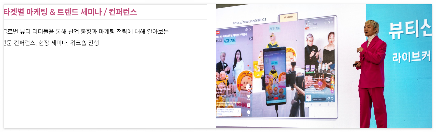 - 타겟별 마케팅 & 트렌드 세미나 / 컨퍼런스: 글로벌 뷰티 트렌드와 마케팅 전략을 소개하는 세미나