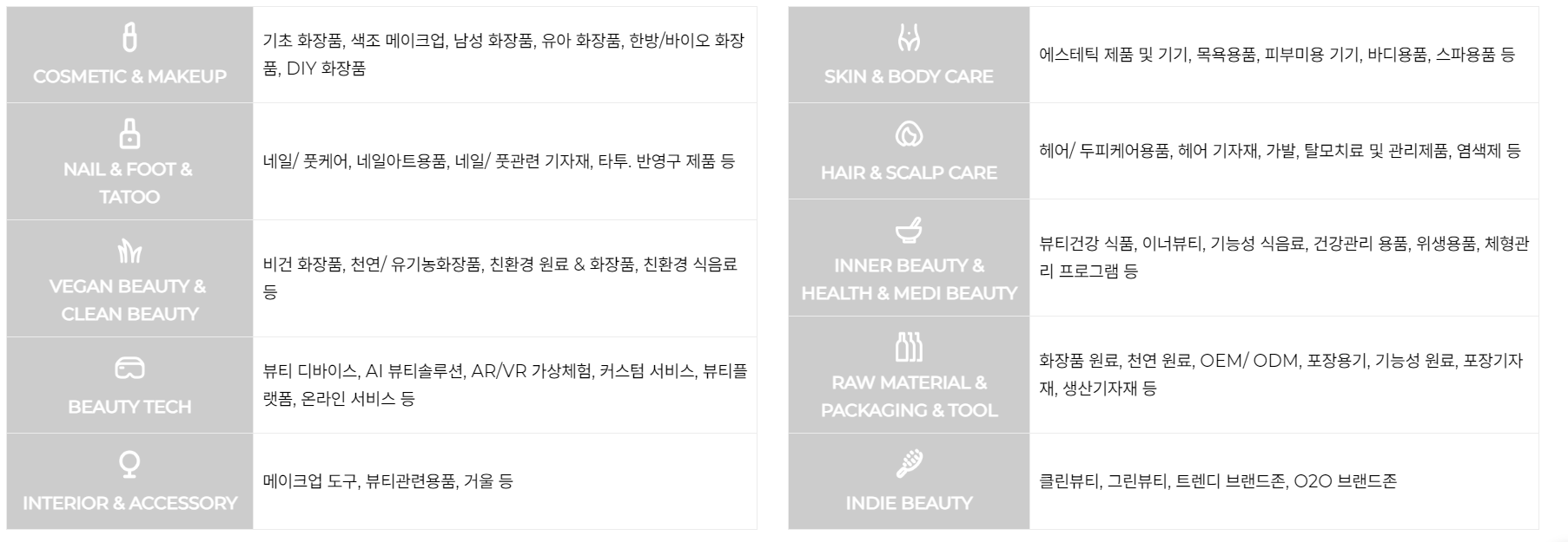 - 기초 및 색조 화장품: 기초화장품, 색조 메이크업, 남성 화장품, 유아 화장품, 한방/바이오 화장품, DIY 화장품